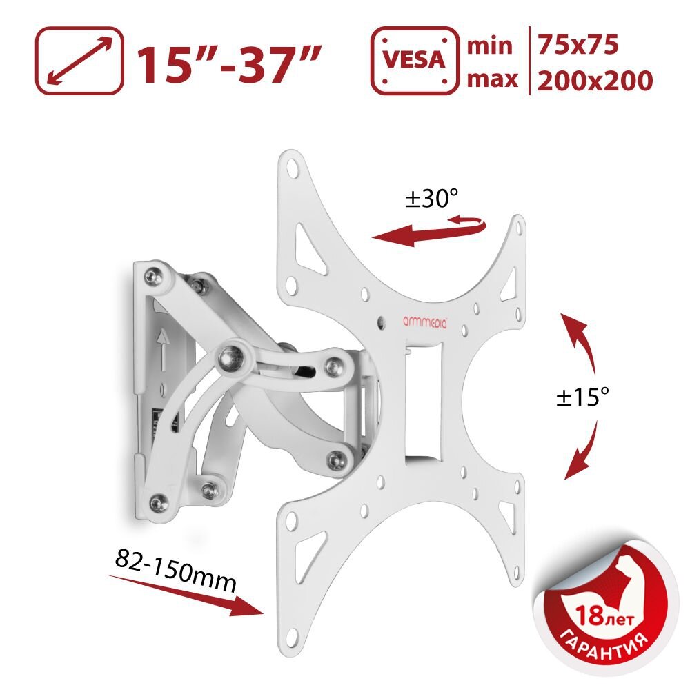 Кронштейн Arm media LCD-301 white, настенный для TV 15"-42", max 30 кг, 2 ст св., нак. ±20°, пов. 180°, от ст. 82-150 мм, max VESA 200x200 м