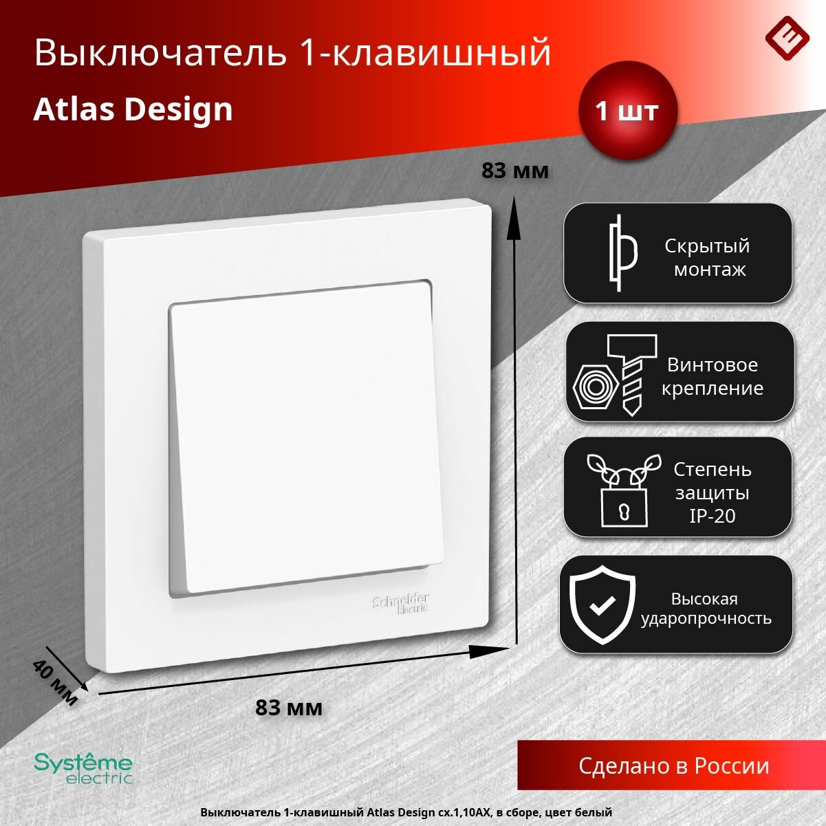 10шт. - Выключатель одноклавишный ATLASDESIGN схема 1 10АХ в сборе белый / Systeme Electric; арт. ATN000112; оригинал / - комплект 10шт