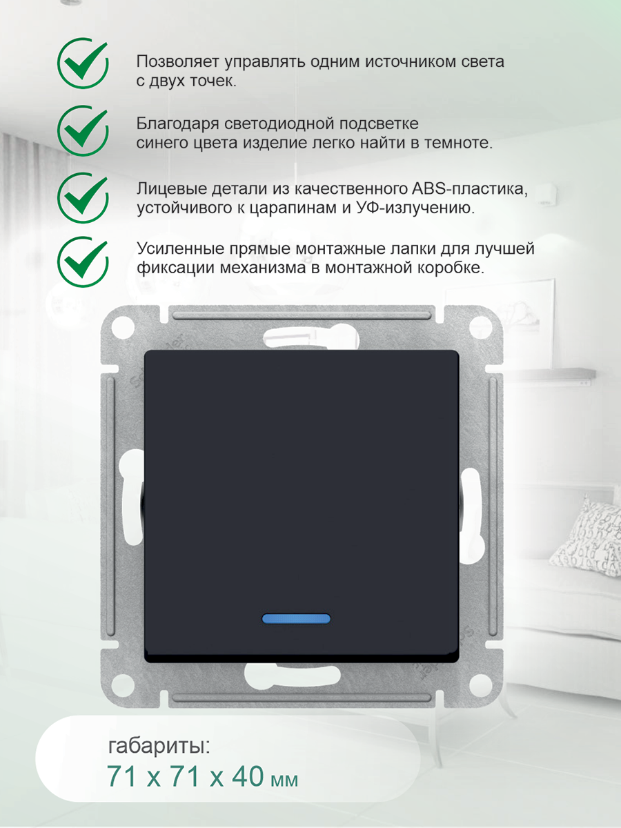 Переключатель/выключатель 9 шт. проходной AtlasDesign 10А одноклавишный с подсветкой Schneider Electric/Systeme Electric механизм скрытая установка карбон ATN001063