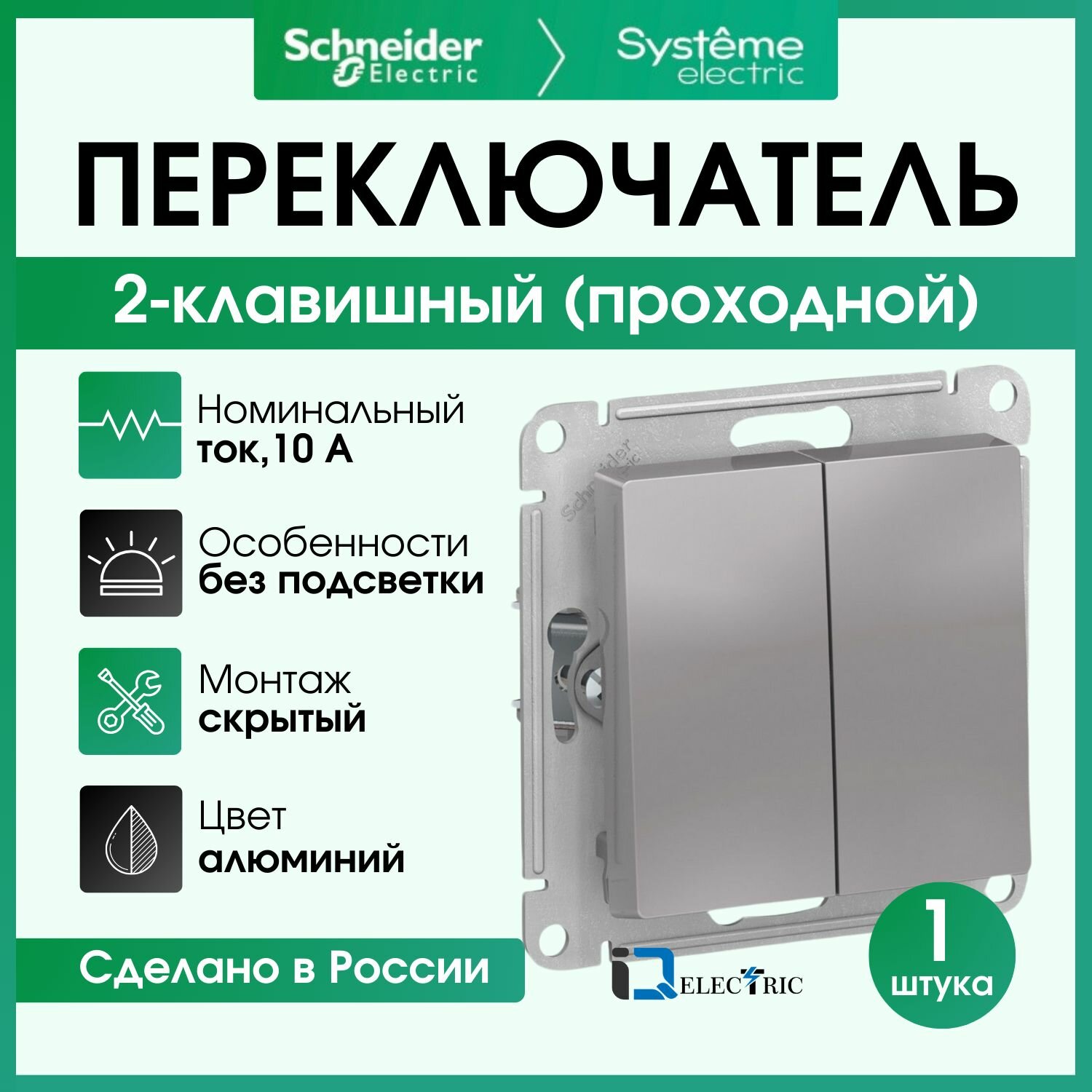 Переключатель 2-клавишный Systeme (Schneider) Electric Atlasdesign, встраиваемый, алюминий