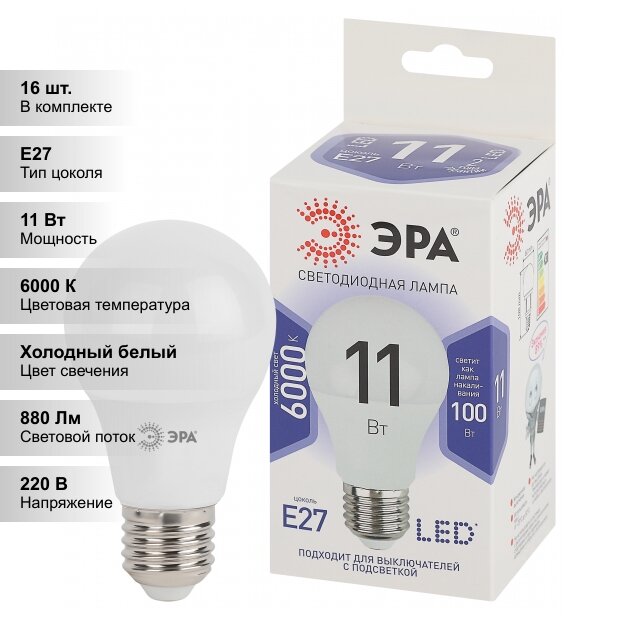 Купить (16 шт.) Светодиодная лампочка ЭРА A60 11Вт 170-265В 6000K E27