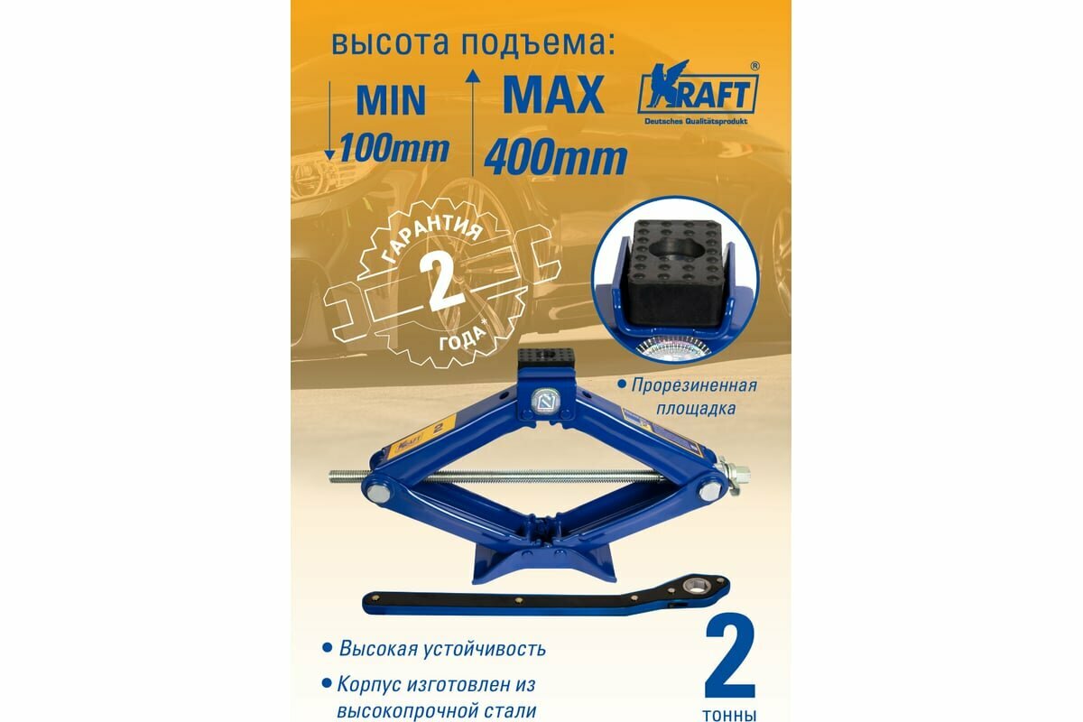 Домкрат ромбический 2 т. Kraft с трещоточной рукояткой 100-400 мм