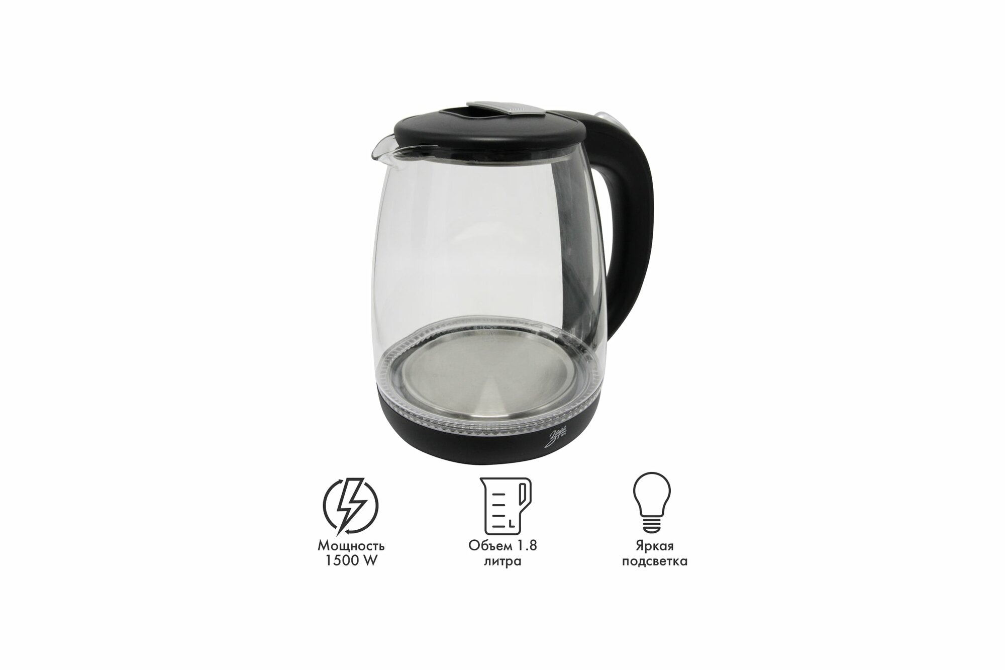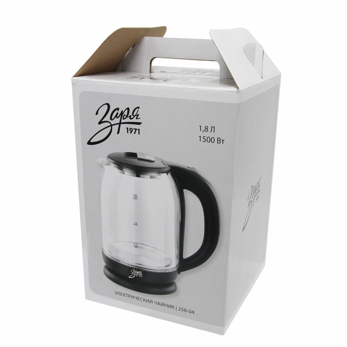 Электрический чайник Заря 258-04 1.8 л / стеклянный / с подсветкой / дисковый ТЭН / автоотключение / поворот на 360 / электрочайник / 1500 Вт / черный