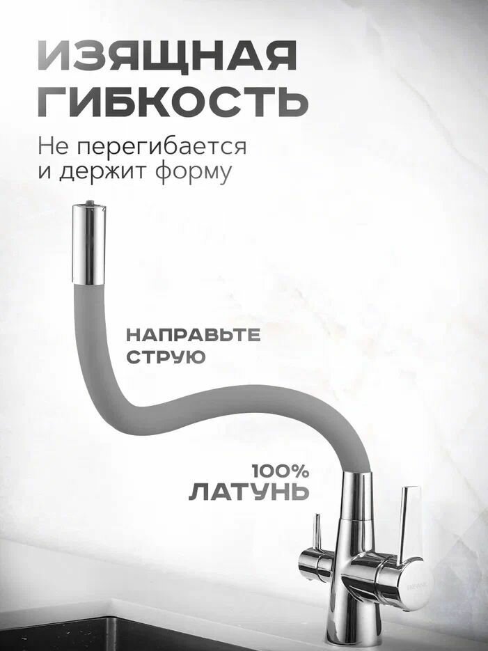 Смеситель комбинированный силиконовый с гибким изливом и с подключением фильтра питьевой воды, серый/хром