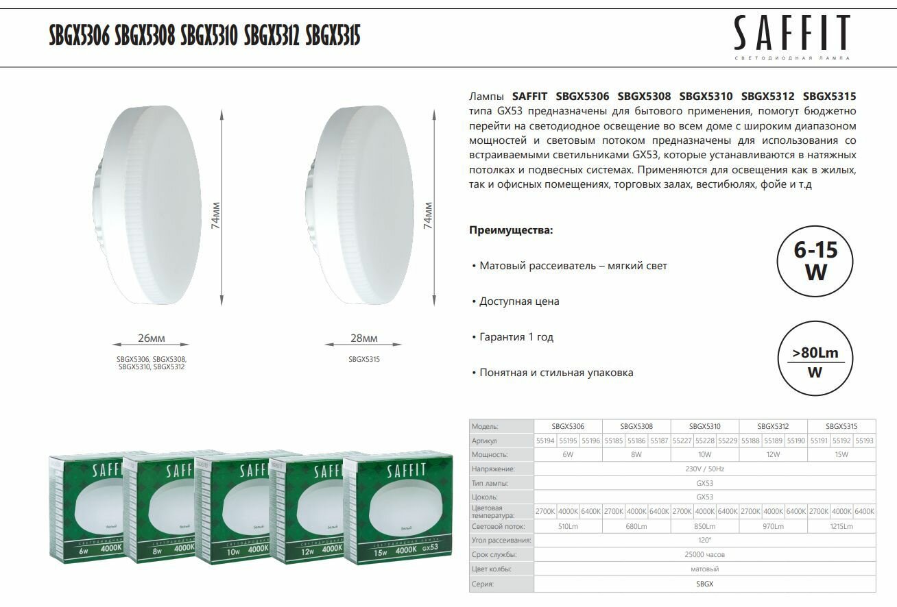 Лампа светодиодная SAFFIT SBGX5315, GX53, 15W, 6400K, дневной белый свет, 10 шт