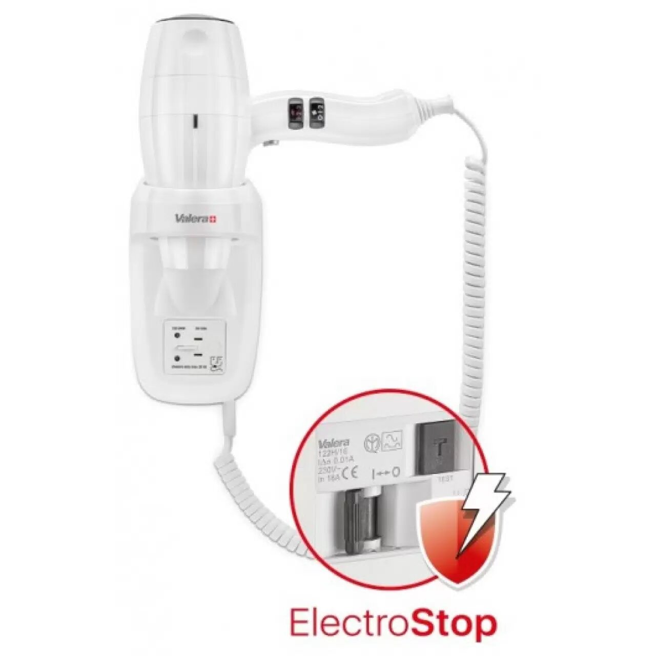 Фен настенный Valera Hospitality Silent Jet Protect 2000 Shaver (586.10/044.06), мощность 2000 Вт, сверхтихий, безопасная кнопка включения/выключения, настенный держатель c устройством защитного отключения, технология быстрой сушки, розетка для бритвы