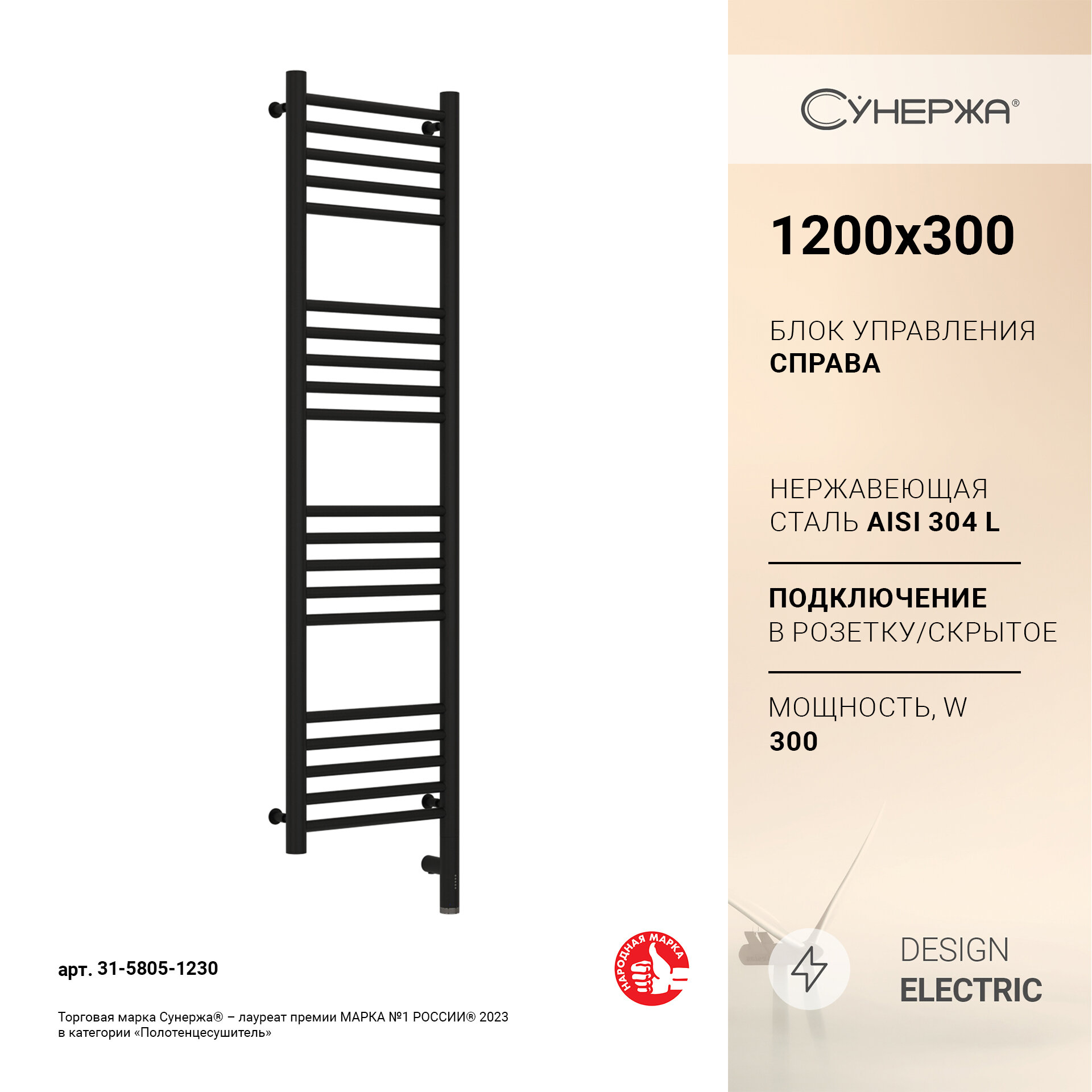 Электрический полотенцесушитель Сунержа Богема 3.0 прямая 1200х300 31-5805-1230 матовый черный
