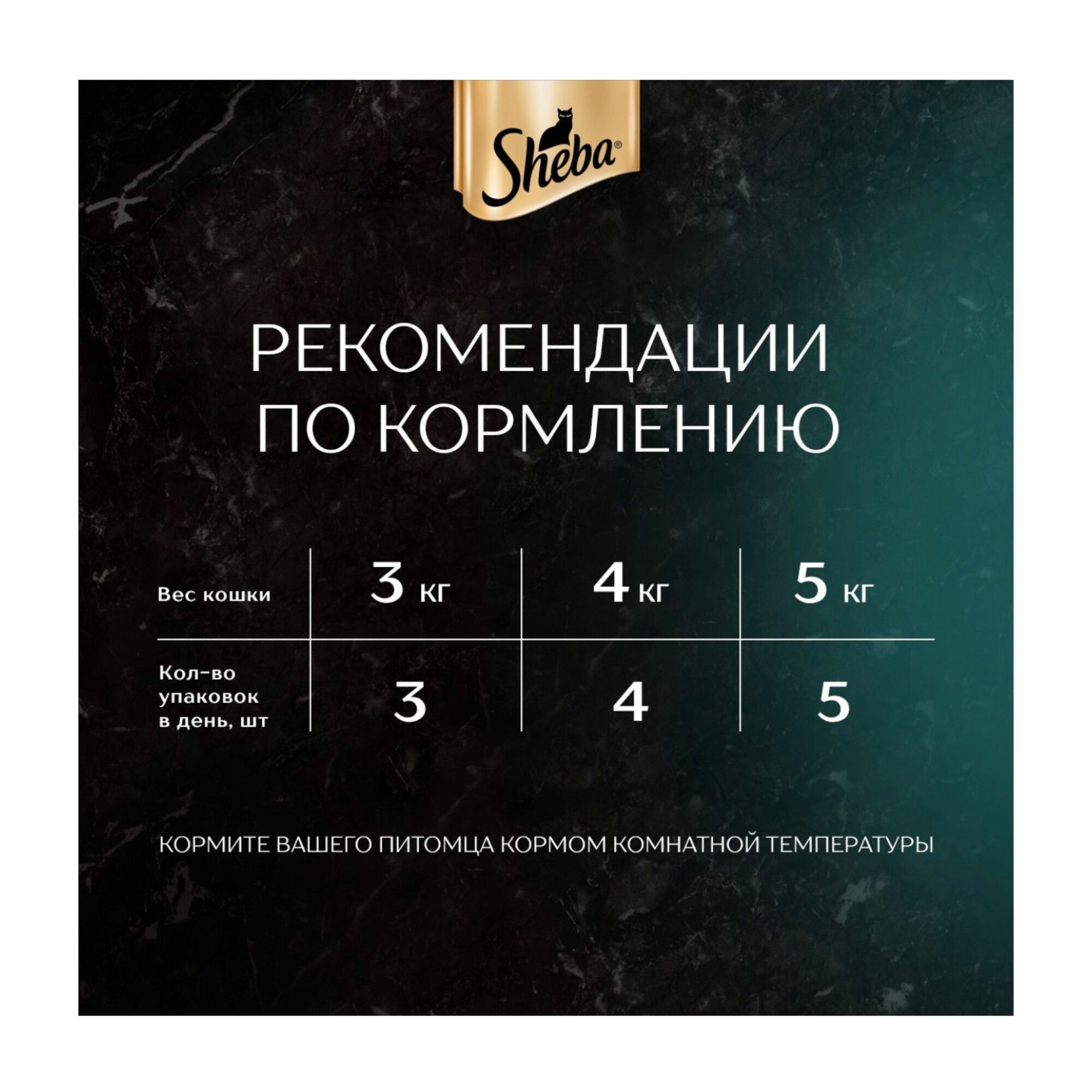 | Дозировка | - вес кошки 3 кг – 3 упаковки корма в сутки - вес кошки 4 кг – 4 упаковки корма в сутки - вес кошки 5 кг – 5 упаковок корма в сутки |