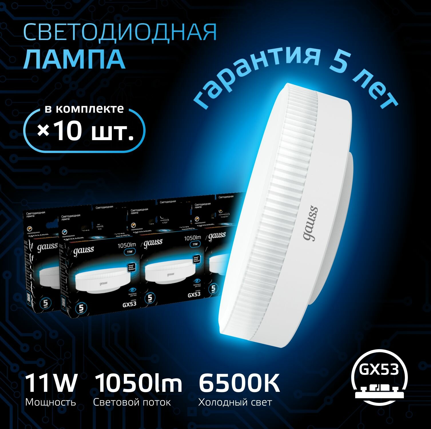 Купить Лампочка светодиодная GX53 11W холодный белый свет 6500К упаковка 10 шт. Gauss