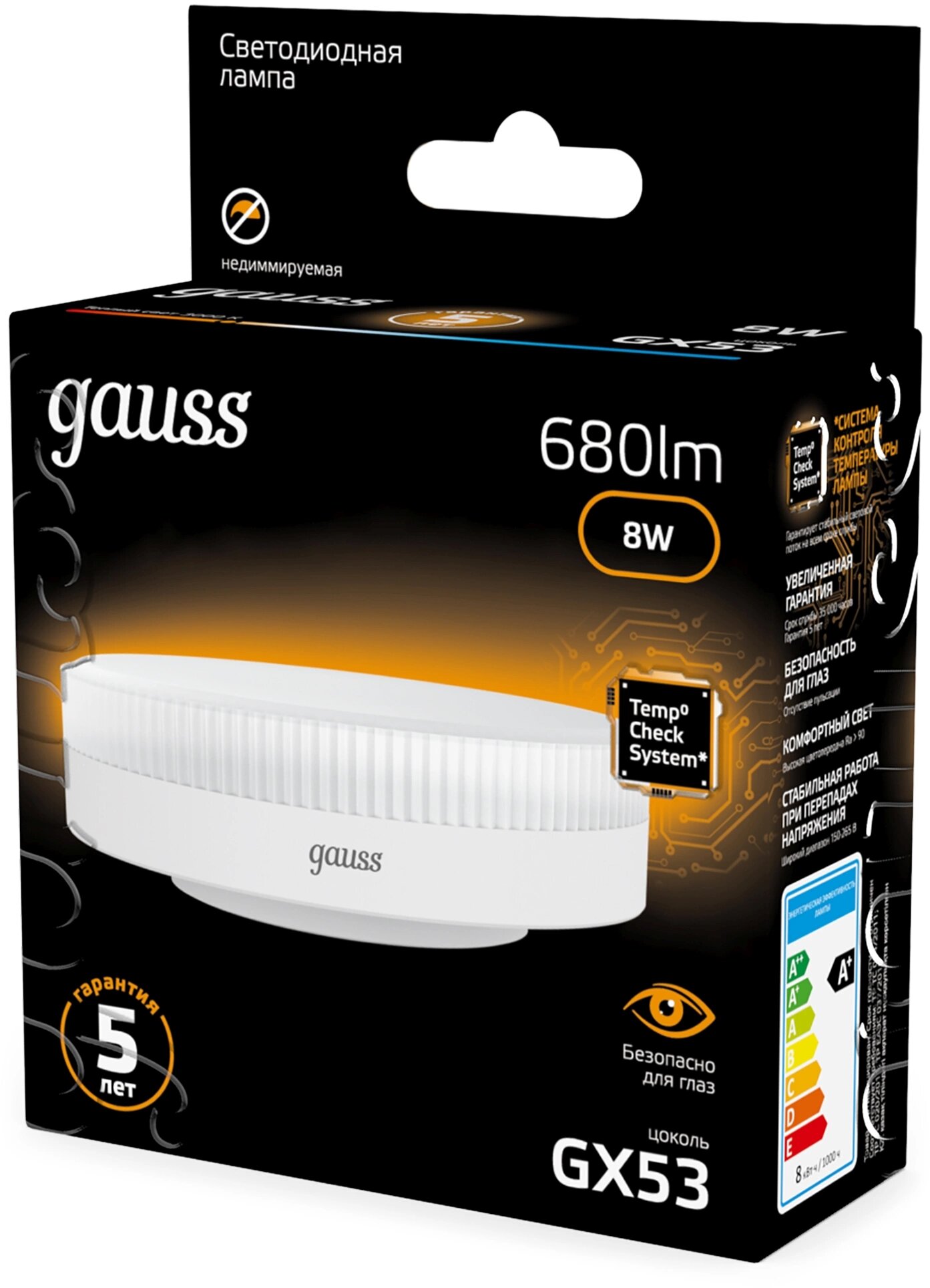 Лампа светодиодная Gauss 8Вт цок.:GX53 таблетка 220B св.свеч.бел.теп. Tablet (упак.:10шт) (108008108) интересное: