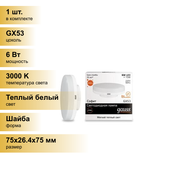 (15 шт.) Светодиодная лампочка Gauss Elementary GX53 6W(440lm) 3000 2K 75x26.4 пластик/алюм. 83816 Теплый белый. Цоколь GX53