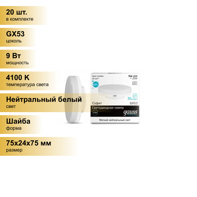 Сохранить(20 шт.) Светодиодная лампочка Gauss Elementary GX53 9W(680lm) 4100K 4K 75x24 пластик/алюм.83829 Нейтральный белый. Цоколь GX53 интересное: