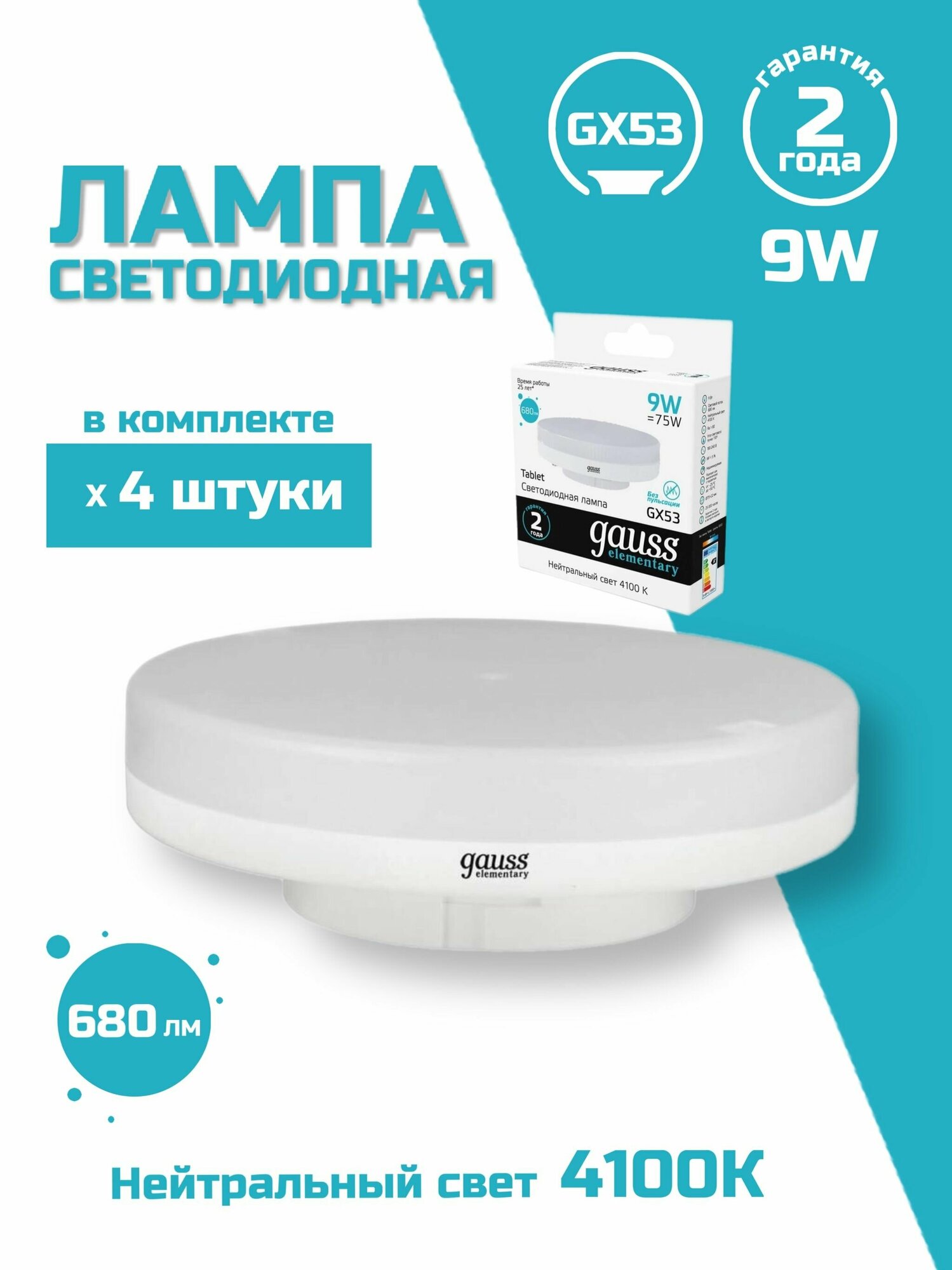 Лампочка светодиодная Gauss Elementary 9В эквивалент 75В 4100K 680Лм GX53 таблетка 83829 (комплект из 4 шт.)