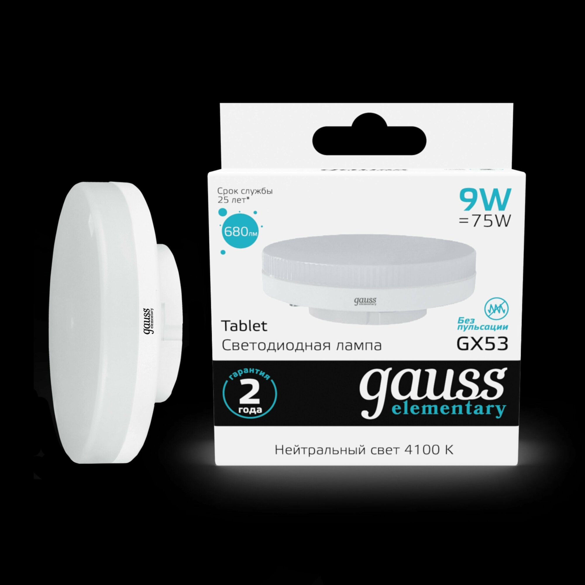(25 шт.) Светодиодная лампочка Gauss LED Elementary, мощность 9 Вт, напряжение питания 180-240 В, цветовая температура 4100 K, нейтральный белый свет, цоколь GX53, размер 73х28.5 мм