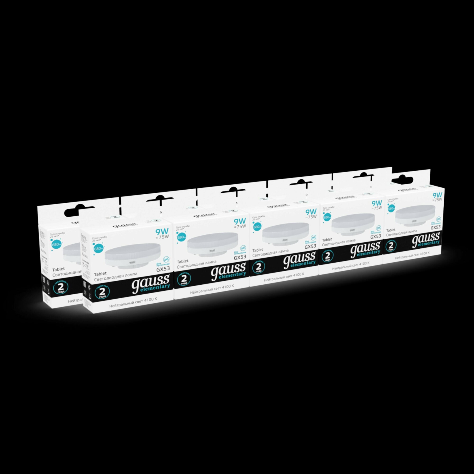 (4 шт.) Светодиодная лампочка Gauss LED Elementary, мощность 9 Вт, напряжение питания 180-240 В, цветовая температура 4100 K, нейтральный белый свет, цоколь GX53, размер 73х28.5 мм