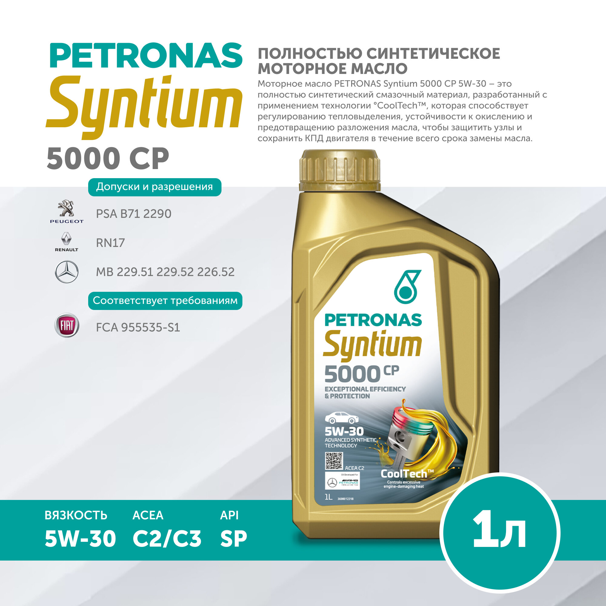 Купить Моторное масло PETRONAS SYNTIUM 5000 CP 5W-30 Синтетическое 1л PSA B71 2290, Renault RN17, MB-Approval 229.51 229.52 226.52, FCA 955535-S1, API SP, ACEA C2 C3, 70830E18EU