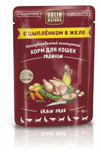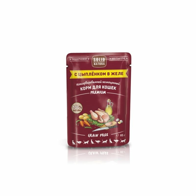 SOLID NATURA PREMIUM GRAIN FREE беззерновой для взрослых кошек с цыпленком в желе (85 гр х 14 шт)