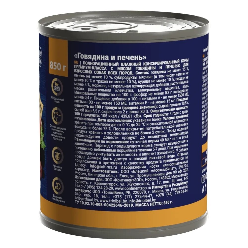 Консервированный корм для собак влажный Brit Premium by Nature / мясные консервы для собак Говядина и печень 850 г