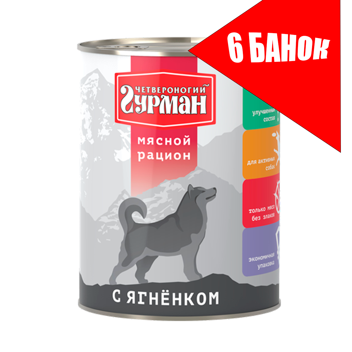 Четвероногий Гурман Мясной рацион консервированный корм премиум класса с бараниной для собак - 850 г, уп (6 шт)