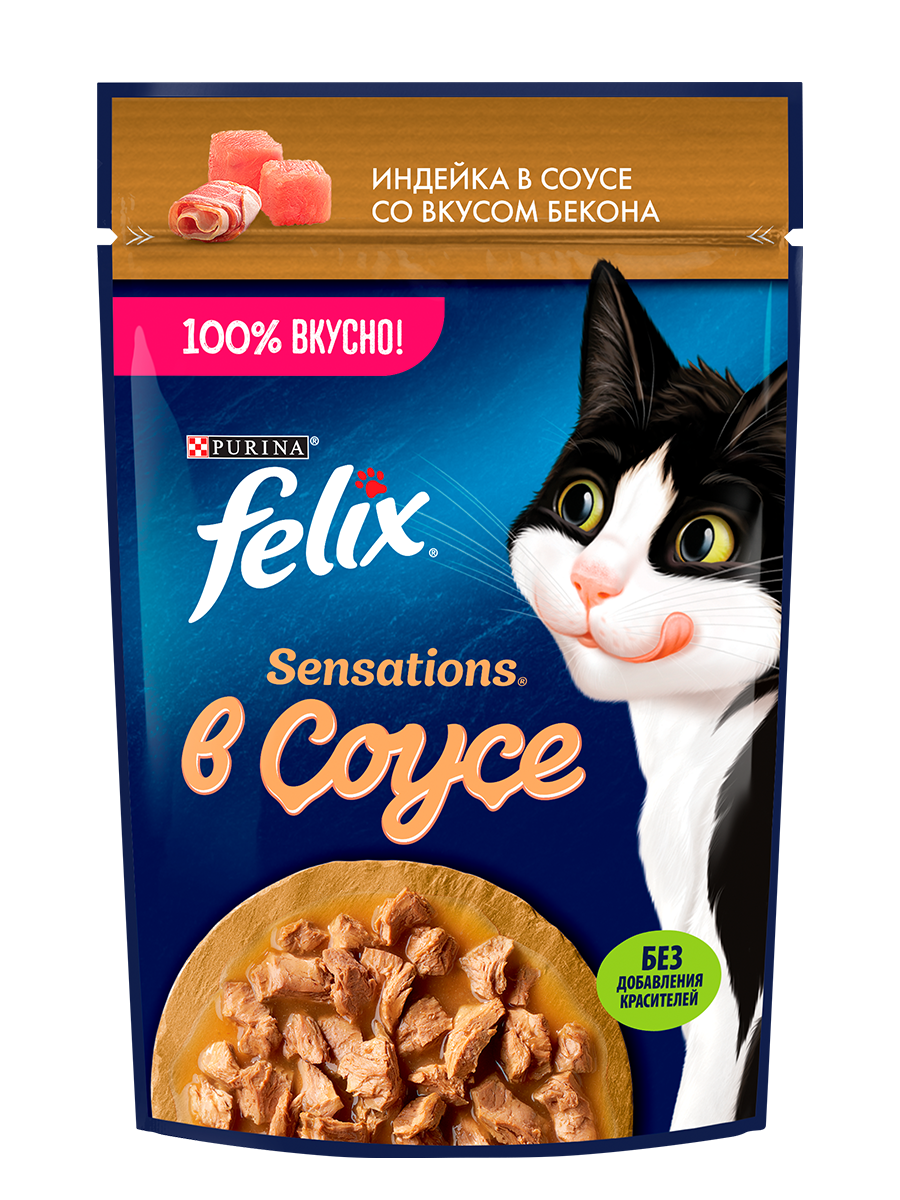 Felix Sensations влажный корм для взрослых кошек, индейка в соусе со вкусом бекона (26шт в уп) 75 гр