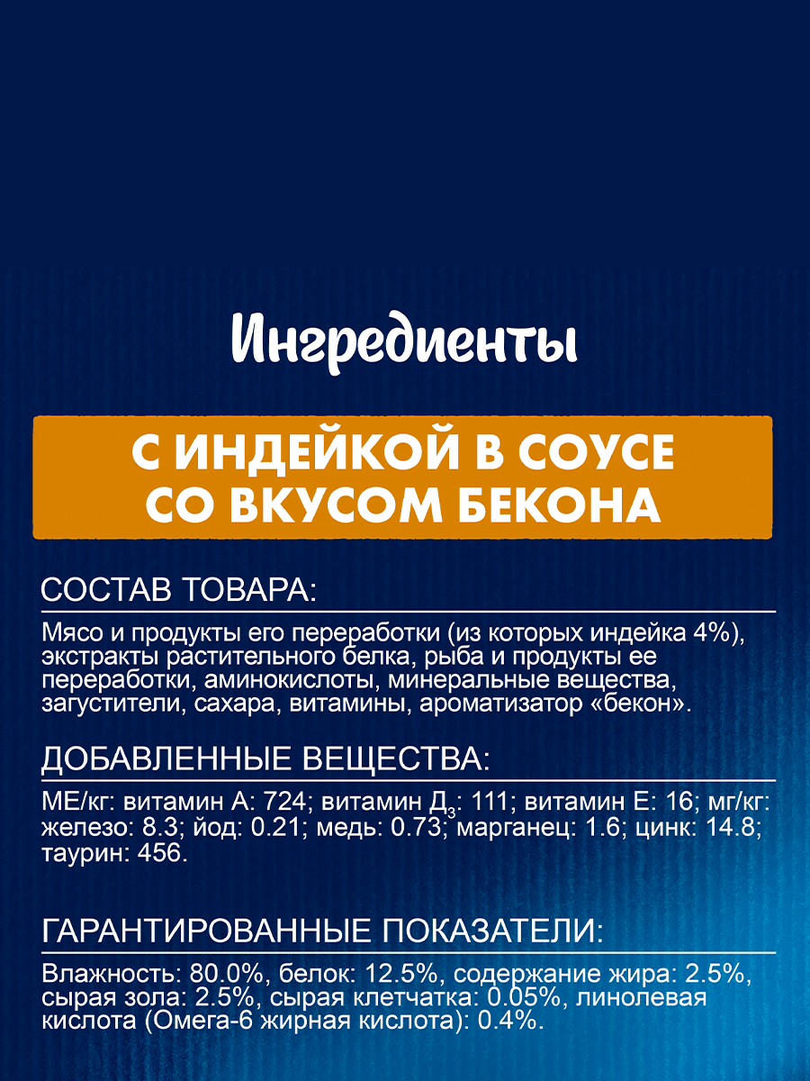 | Состав | мясо и продукты переработки мяса (из которых индейка 4%), экстракт растительного белка, рыба и продукты переработки рыбы, минеральные вещества, сахара, красители, ароматизатор, витамины |