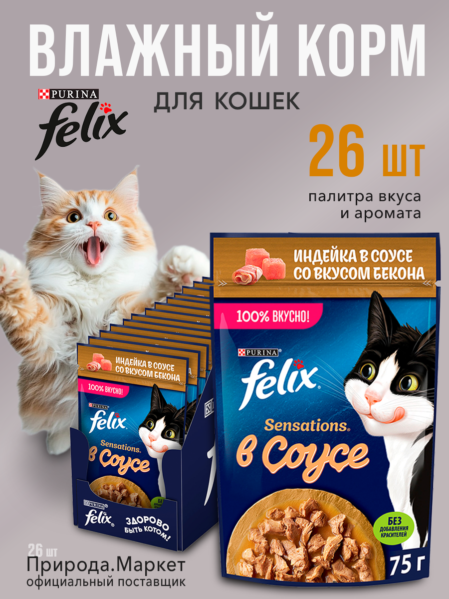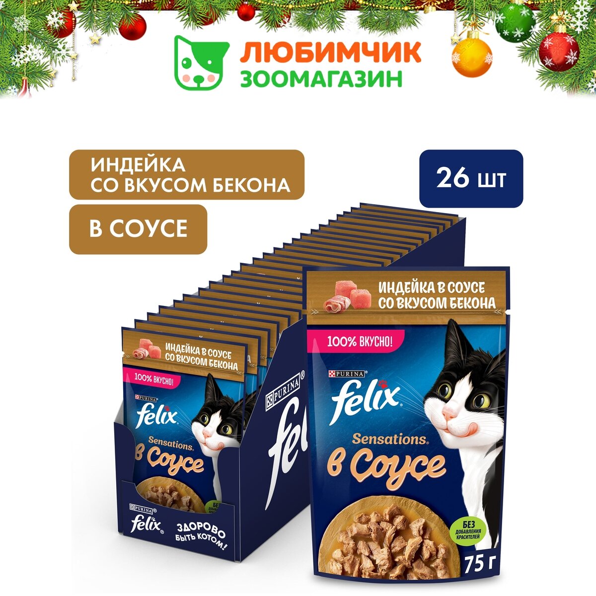 Купить Felix Sensations 75 г пауч влажный корм в удивительном соусе для кошек, индейка с беконом х26 штук