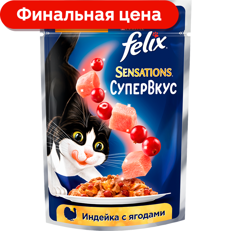 Felix Sensations Супервкус пауч для взрослых кошек (кусочки в желе) Индейка и ягоды, 75 г. упаковка 26 шт