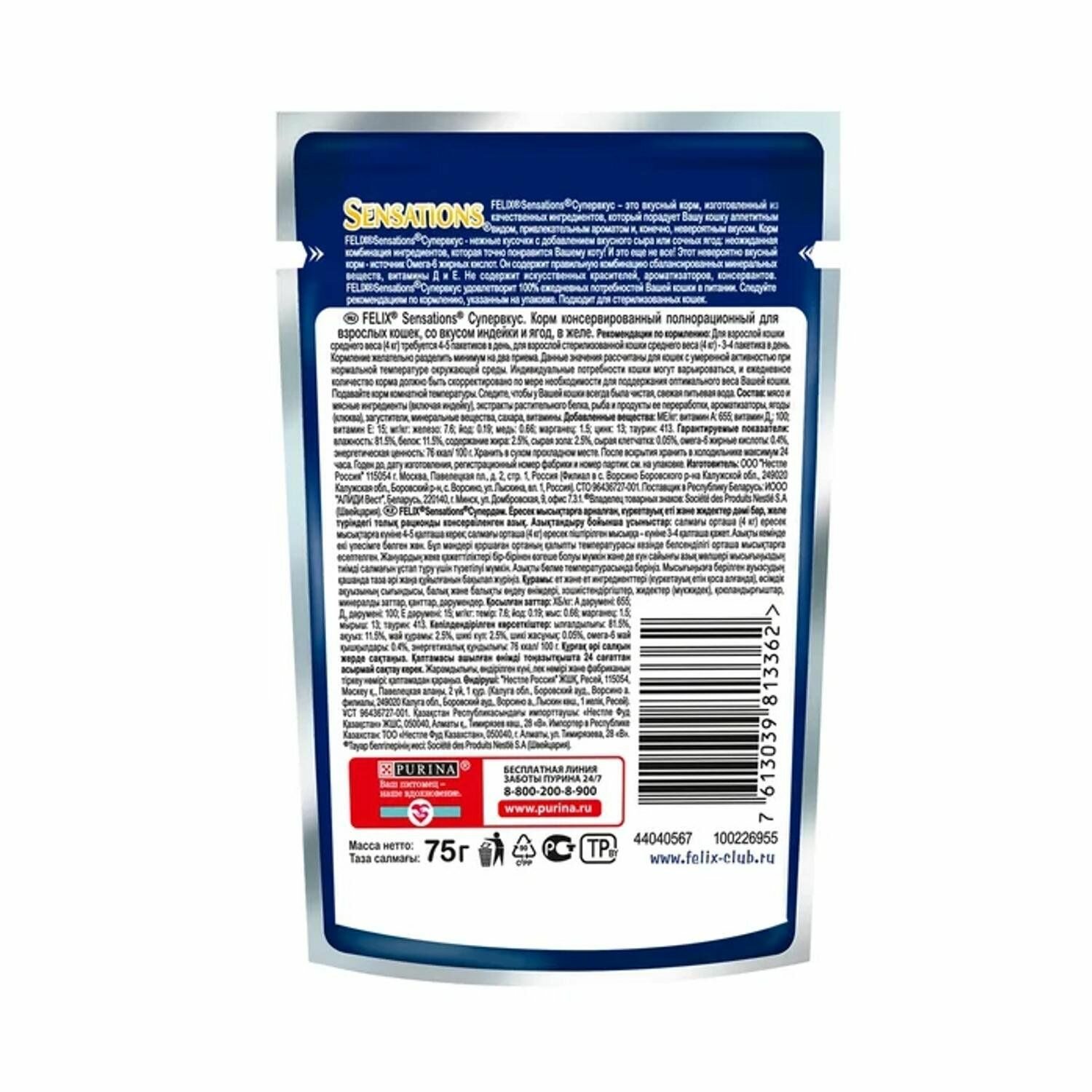 Felix Паучи Sensations кусочки в желе для кошек Супер Вкус Индейка и Ягоды 1244903812493545 0,075 кг 44234 (34 шт)