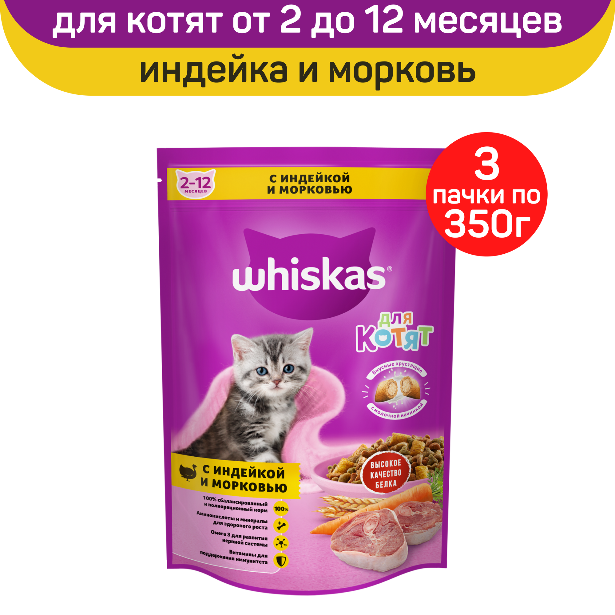 Сухой полнорационный корм WHISKAS для котят от 2 до 12 месяцев с индейкой, морковью и вкусными подушечками, 3 шт по 350 г