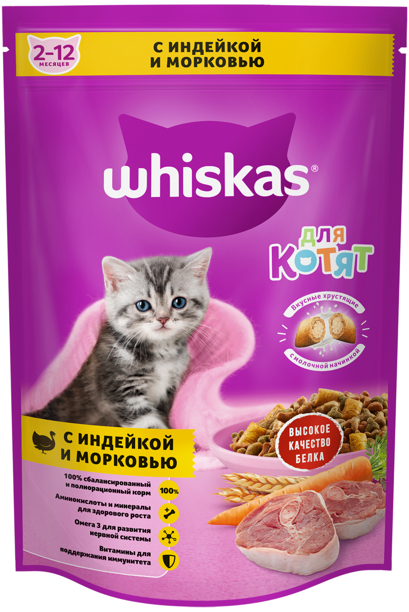 Купить Сухой корм WHISKAS для котят Подушечки с молочной начинкой, с индейкой и морковью, 350г*3штуки