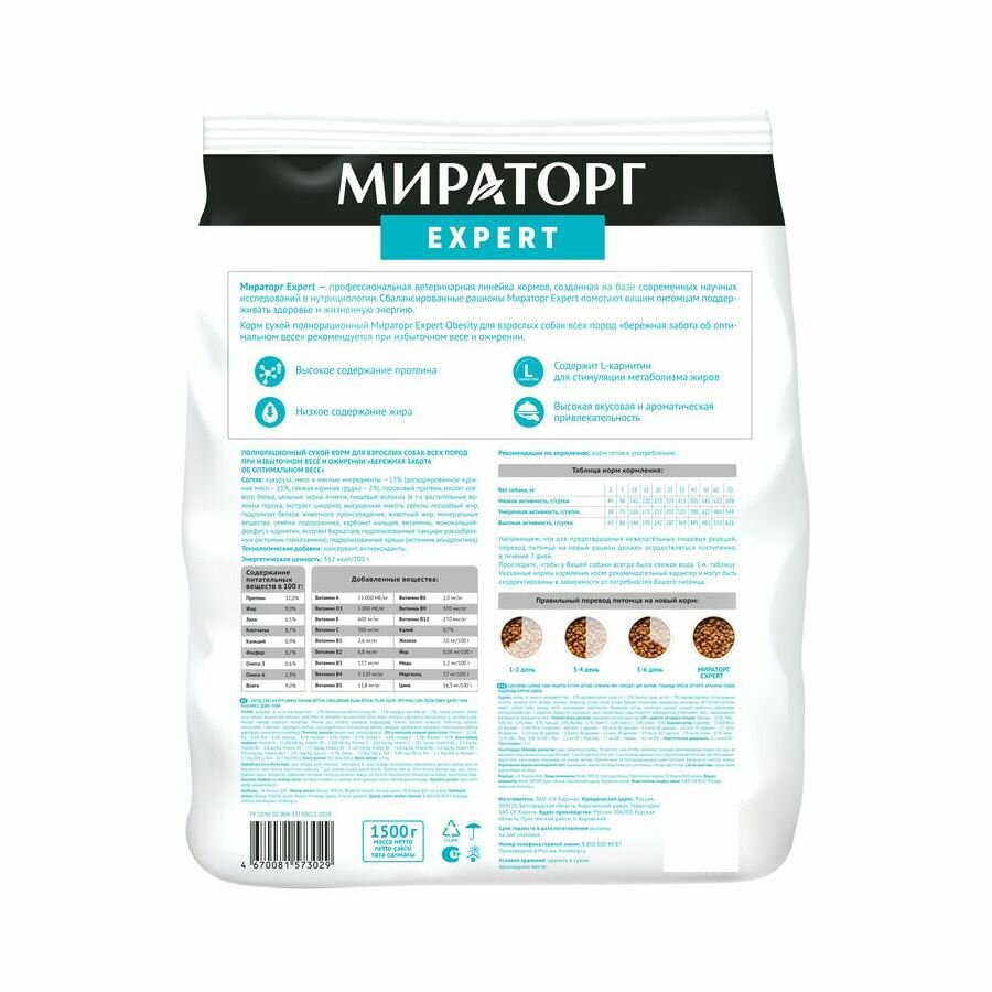 Сухой корм мираторг Expert для взрослых собак всех пород при избыточном весе и ожирении Бережная забота об оптимальном весе 1,5кг