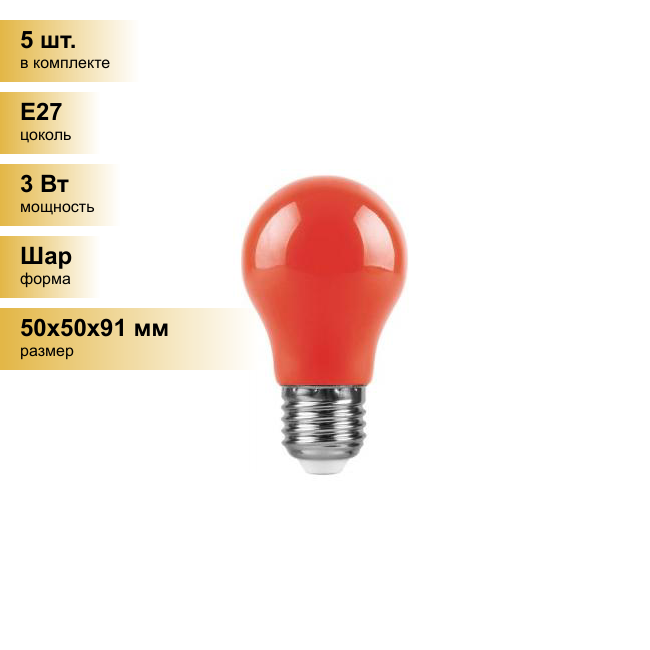 Лампа светодиодная, (3W) 230V E27 красный A50, LB-375, 5 шт.