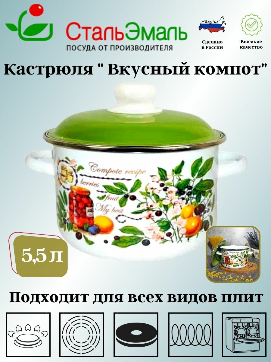 Кастрюля эмалированная СтальЭмаль Вкусный компот с крышкой, 5,5 л