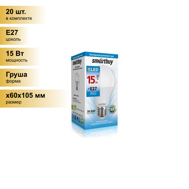 Сохранить(20 шт.) Светодиодная лампочка Smartbuy ЛОН A60 E27 15W(1200lm) 6000K 6K 119x60 SBL-A60-15-60K-E27 . Цоколь E27 интересное: