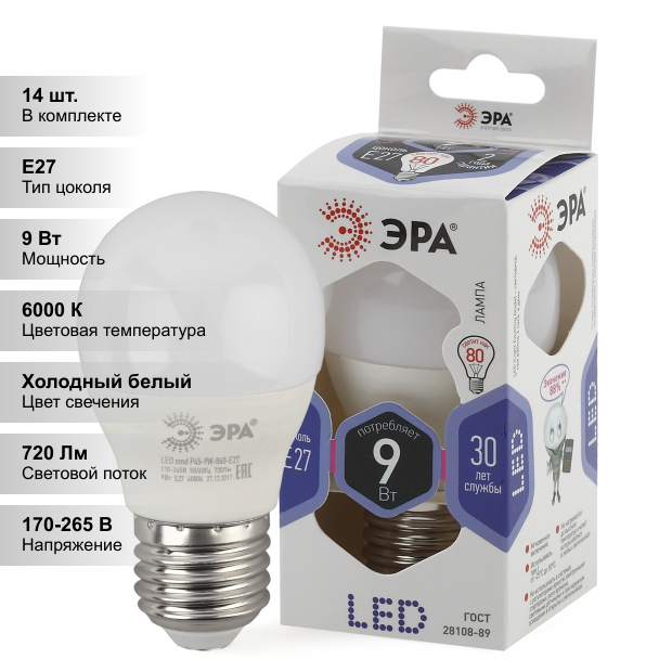 Лампа светодиодная ЭРА Б0031412, E27, P45, 9 Вт, 6000 К