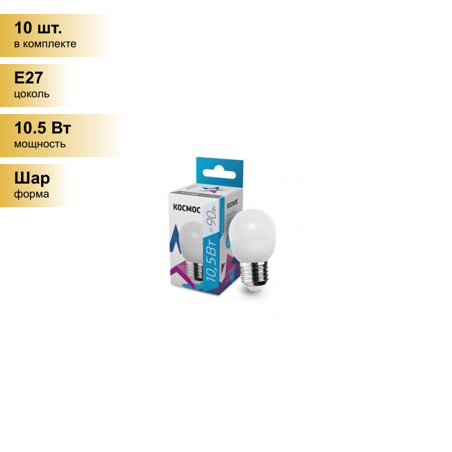 Купить (10 шт.) Светодиодная лампочка Космос шар E27 10,5W (10W) (860lm) 4500K 4K матов. 82x45 LkeLED10.5wGL45E2745 . Цоколь E27