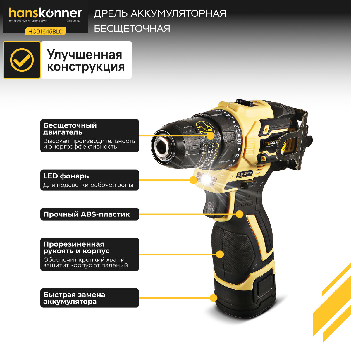 Аккумуляторный шуруповерт Hanskonner HCD1645BLC