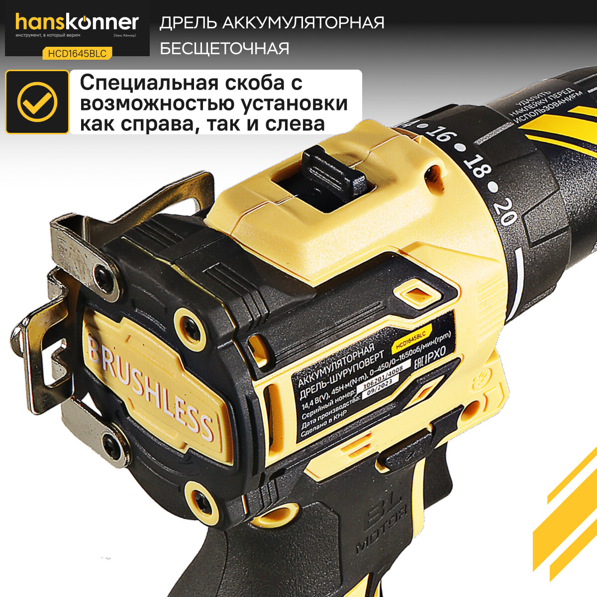 дрель-шуруповерт HANSKONNER HCD1645BLC 14,4В 2,0Ач 2АКБ бесщеточный аккумуляторный
