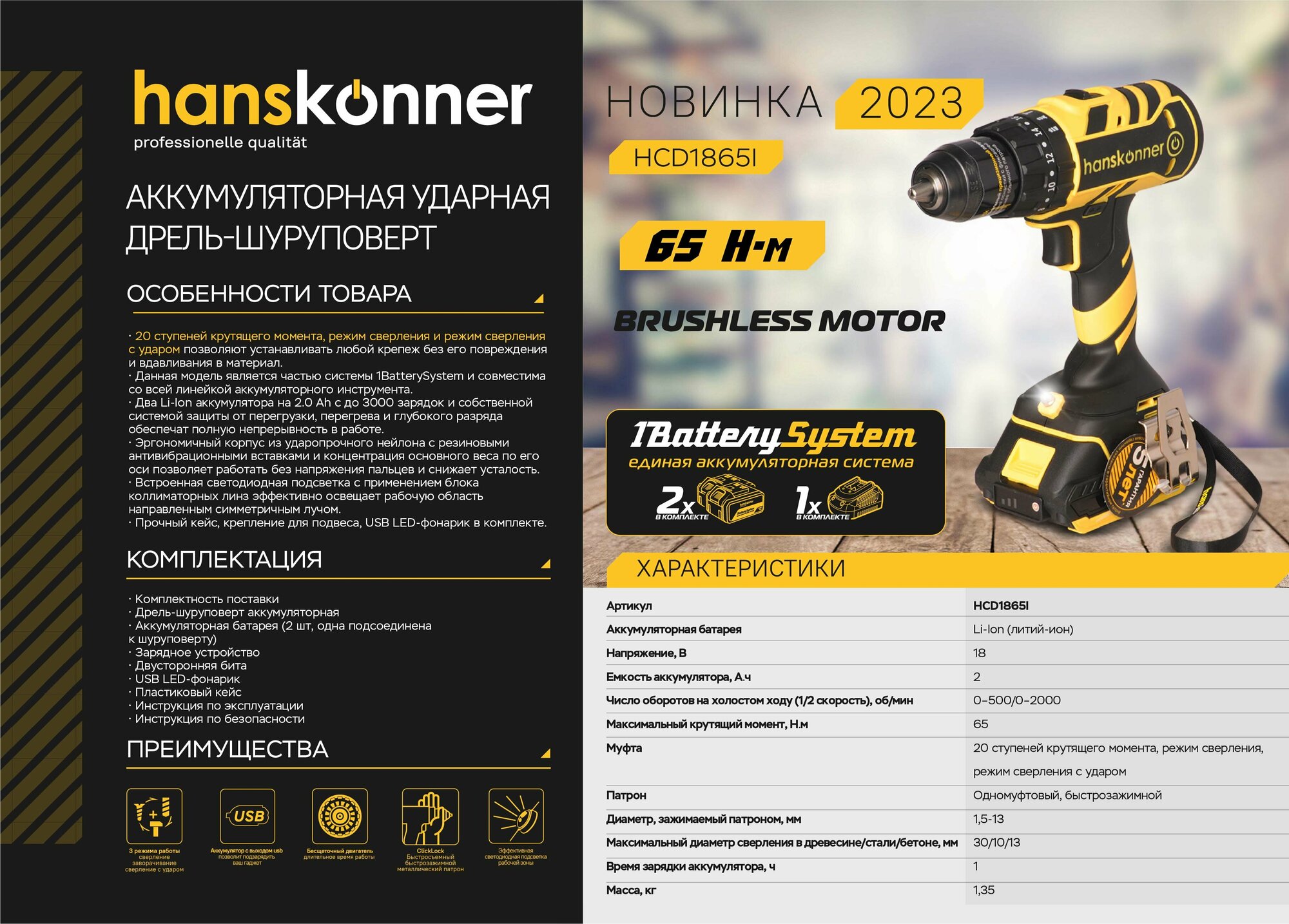 СохранитьДрель-шуруповерт аккумуляторная HANSKONNER HCD1865I интересное: