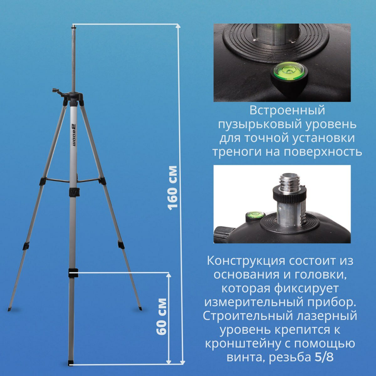 Штатив для лазерного уровня 2м с резьбой 5/8 Boom - тренога (стойка) для нивелира, лазерной рулетки, под легкое строительное оборудование, фотоаппарат, кольцевую лампу