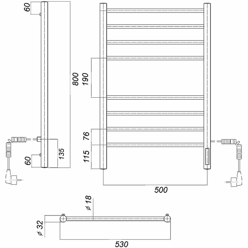 | Дополнительная информация | Полотенцесушитель в сборе 1 шт., Комплект для скрытого подключения 1 шт., Провод с вилкой 1 шт., Кронштейн к стене - 4 шт., Паспорт на изделие |