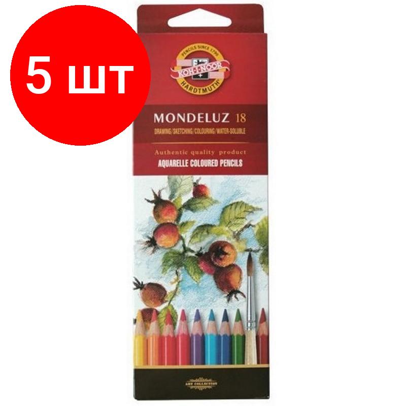 Комплект 5 шт, Карандаши цветные акварельные художественные KOH-I-NOOR "Mondeluz", 18 цветов, 3.8 мм, заточенные, европодвес, 3717/18, 3717018001KSRU