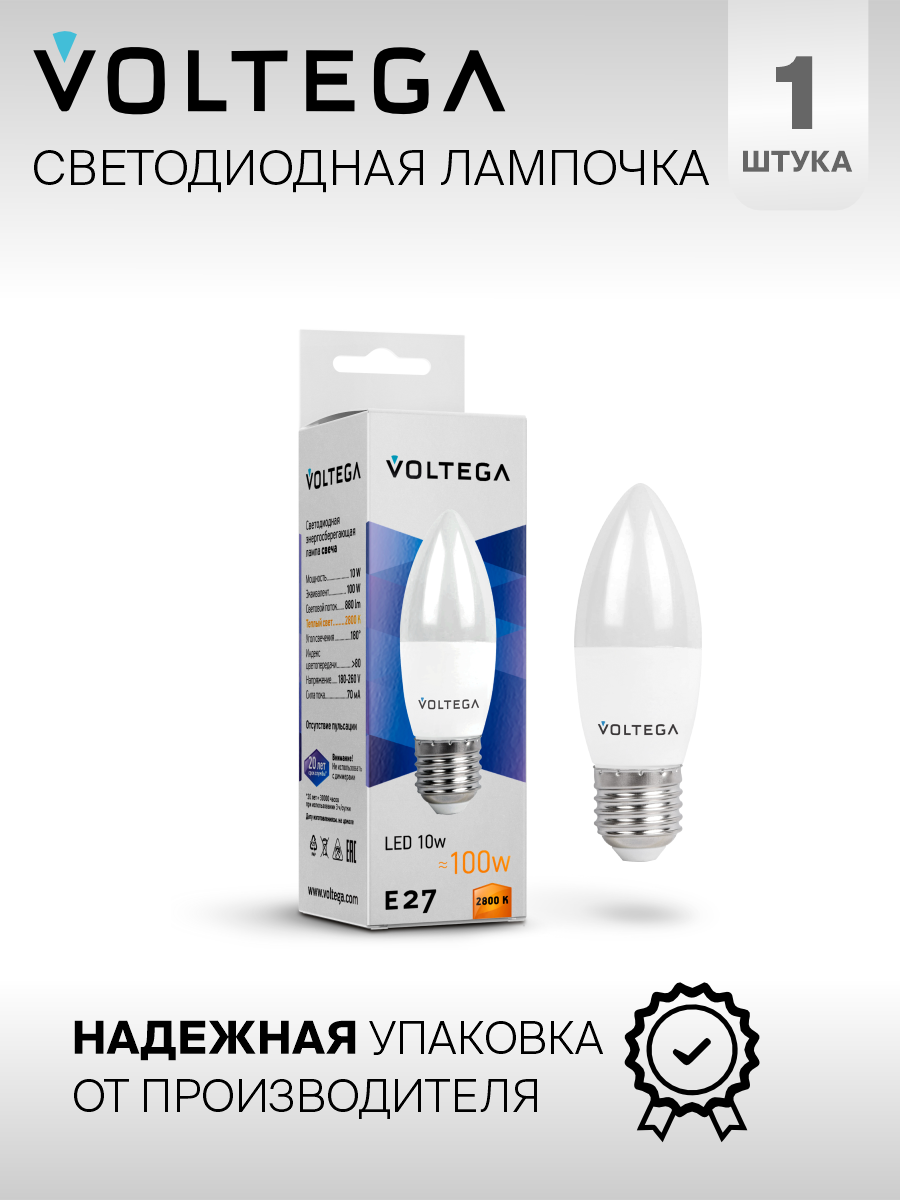 СохранитьСветодиодная лампа Voltega 8451 LED Е27 10W 2800К (теплый белый). Форма колбы лампочки - свеча интересное: