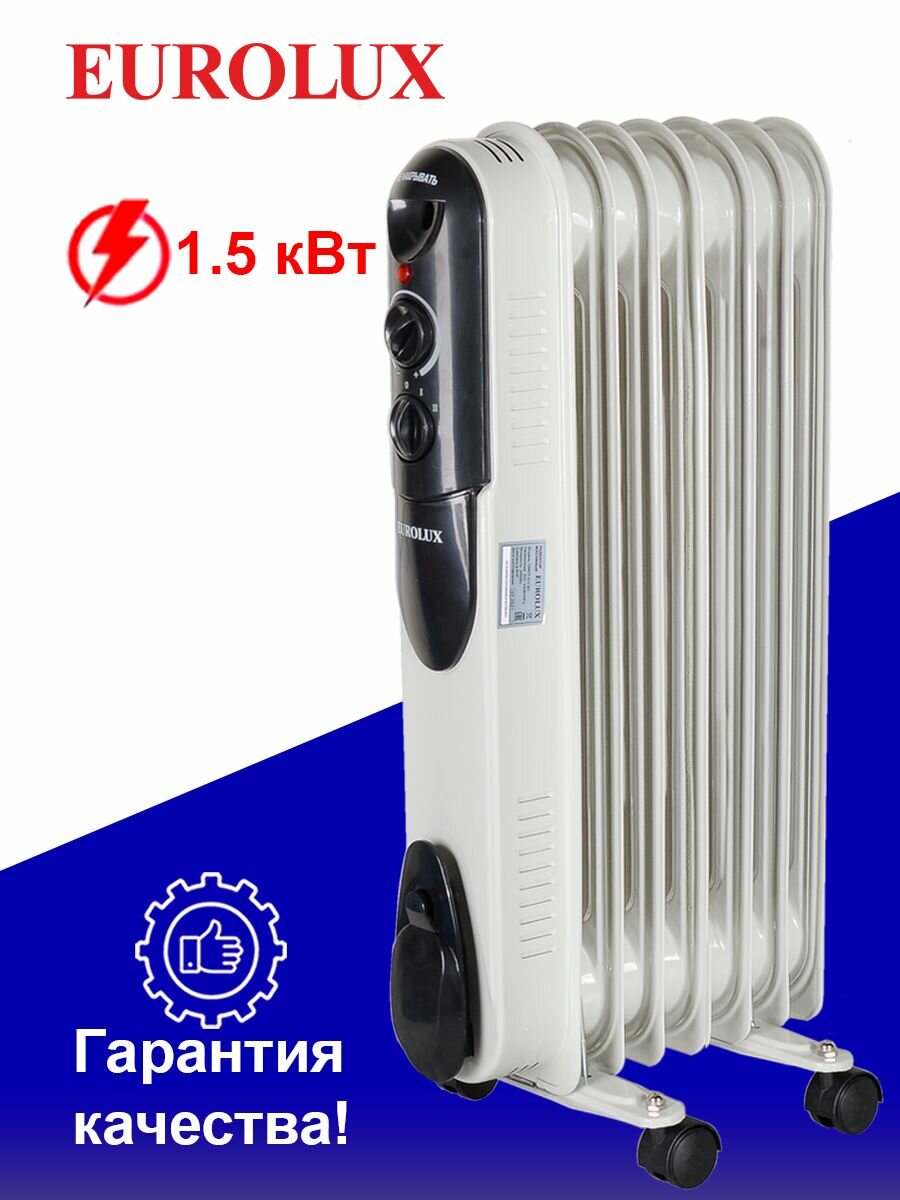 Масляный радиатор Eurolux ОМПТ-EU-7Н, 1.5 кВт, 20 м², колеса в комплекте, белый/черный