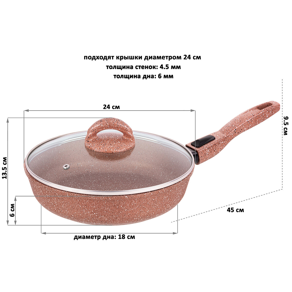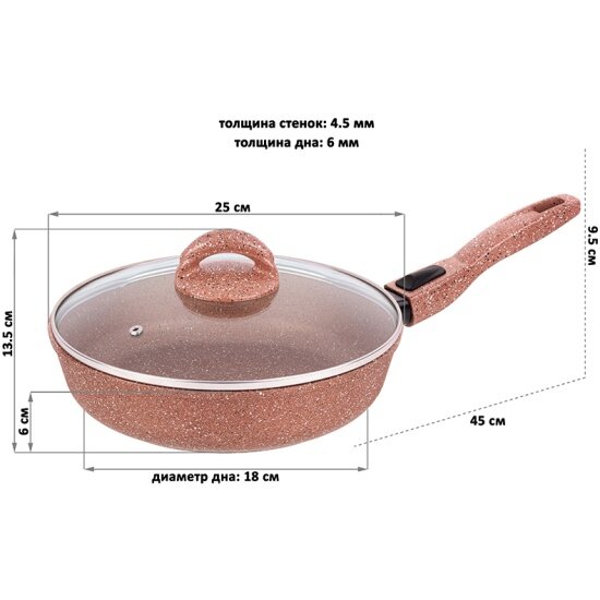 | Комплектация | сковорода, стеклянная крышка, съемная бакелитовая ручка |