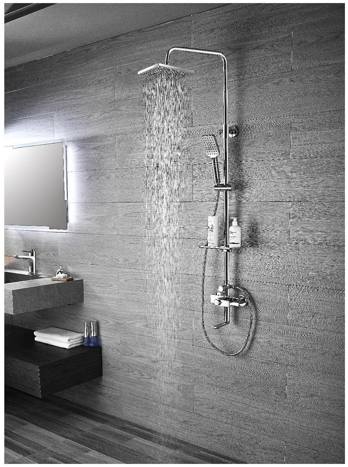 Душевой комплект Rossinka RS50-46 термостатический, с тропическим душем и полочкой
