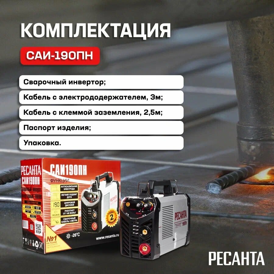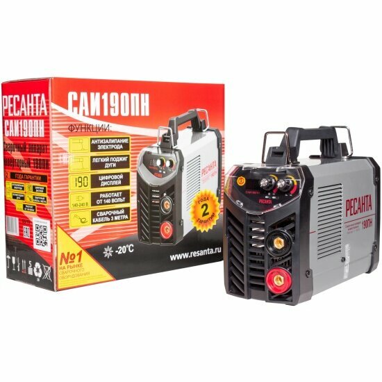 Сварочный аппарат Ресанта САИ-190ПН с возможностью работы от пониженного напряжения, с цифровым дисплеем с лёгким поджигом , 190 ампер , комплект кабелей