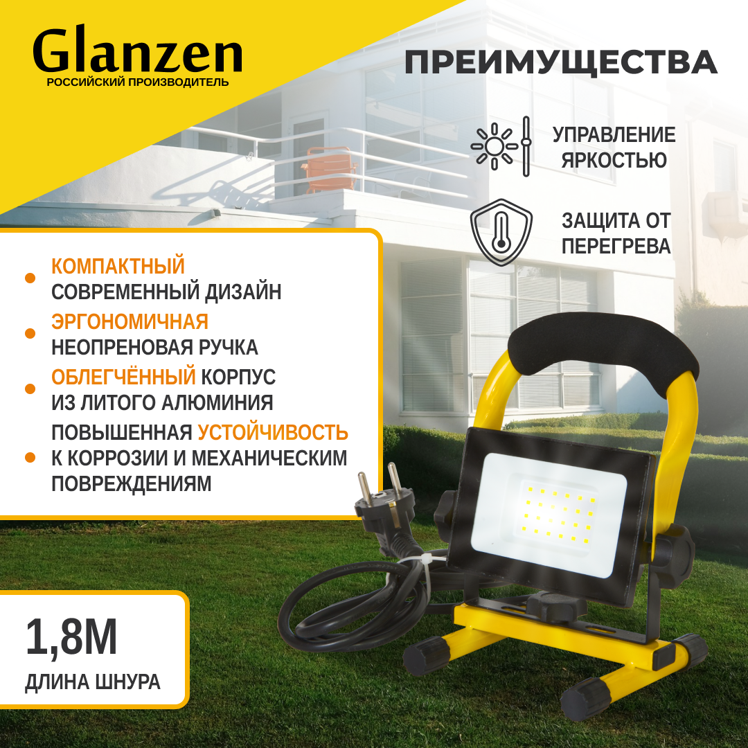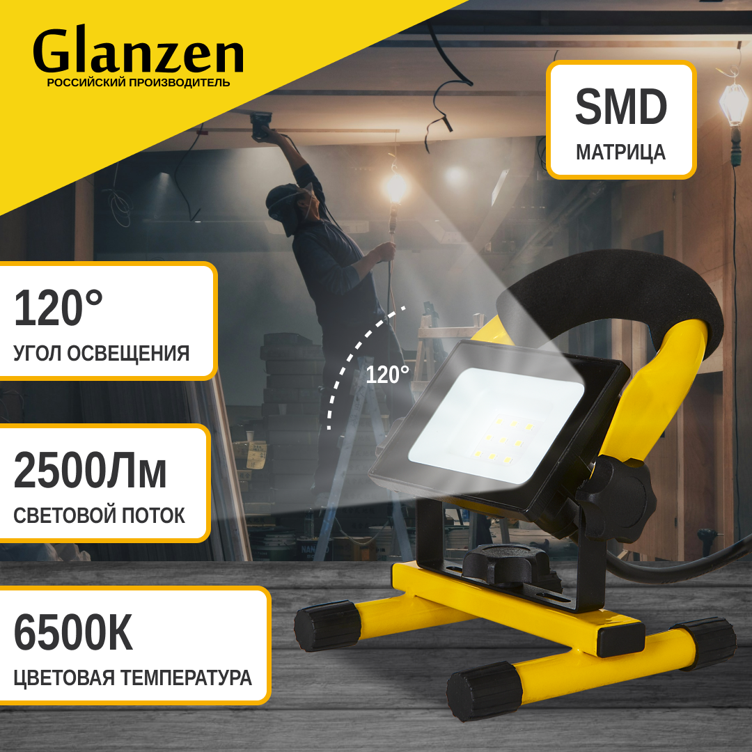 Переносной светодиодный прожектор GLANZEN 30 Вт FAD-0015-30 6500К IP65 интересное: