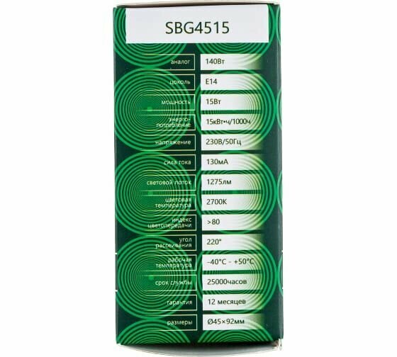 Лампа светодиодная, 15W 230V E14 2700K G45, SBG4515 арт. 55209