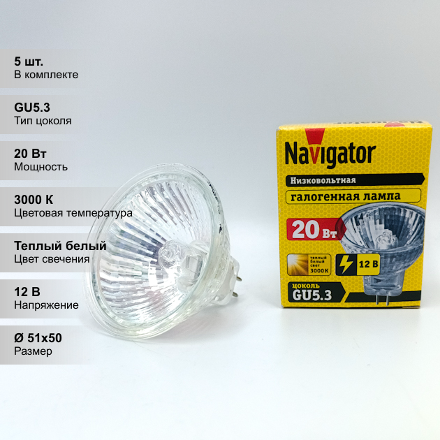 Купить (5 шт.) Низковольтная галогенная лампочка Navigator MR16, мощность 20 Вт, напряжение питания 12 В, цветовая температура 3000 К, теплый белый свет, цоколь GU5.3, диммируемая, размер 51х50 мм